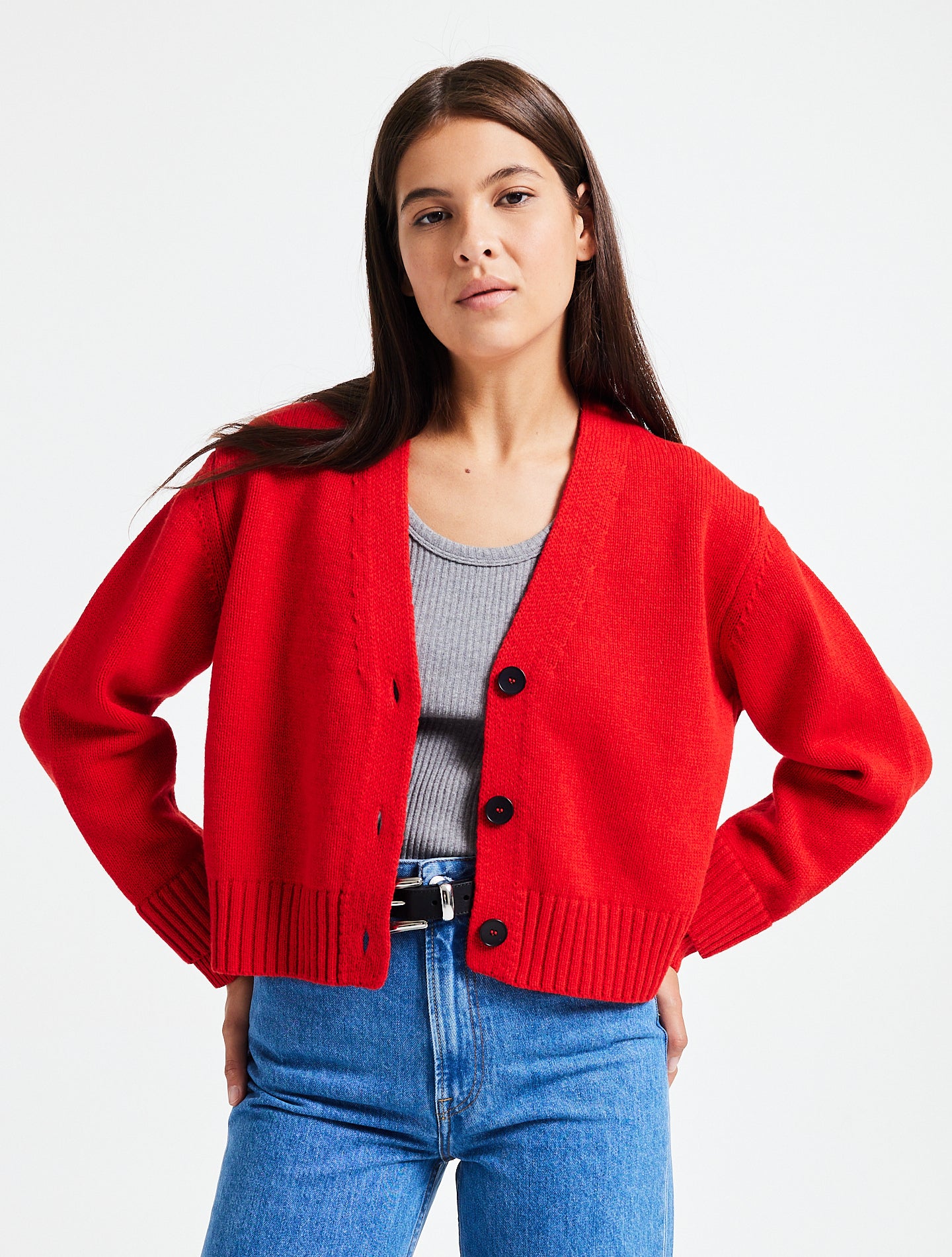Ci-contre nos pulls et cardigans portés avec notre essentiel Patine : le Wide leg Brenda en bleu light ou bleu medium